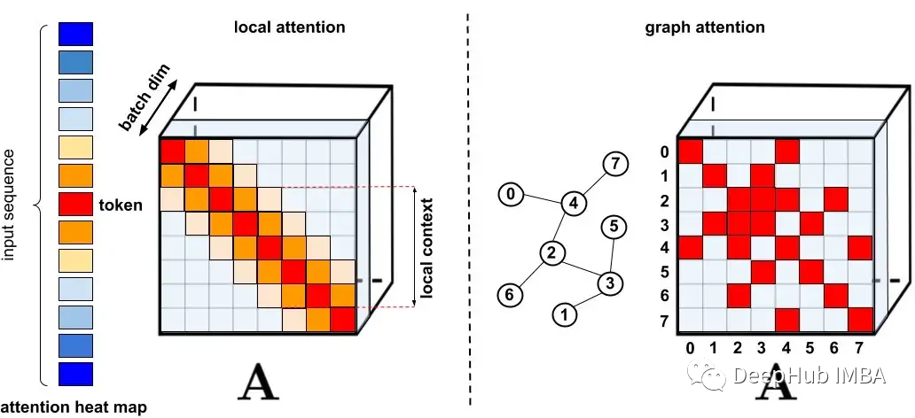左图:稀疏模式示例,其中令牌仅关注附近的其他令牌。