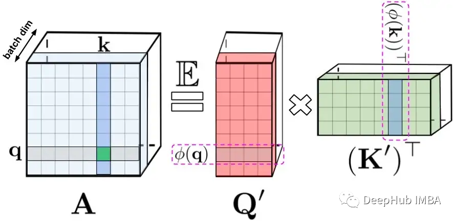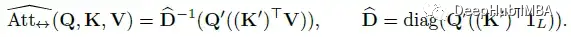 Performer中矩阵A用低秩随机矩阵Q '和K '来近似,这是一种新的基于正交随机特征的快速注意方法(FAVOR+)。FAVOR+适用于注意力块,使用矩阵A的形式如下: