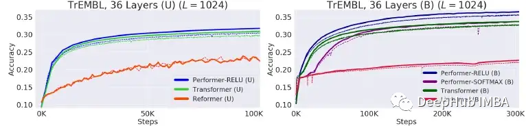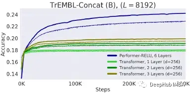 较小的 Transformer (nlayer = 3) 很快就限制在 19%,而 Performer 能够持续训练到 24%。
