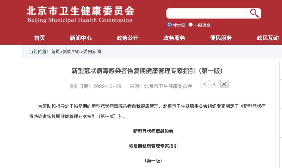 导读:12月29日,北京市卫健委印发《新型冠状病毒感染者恢复期健康管理专家指引(第一版)》。