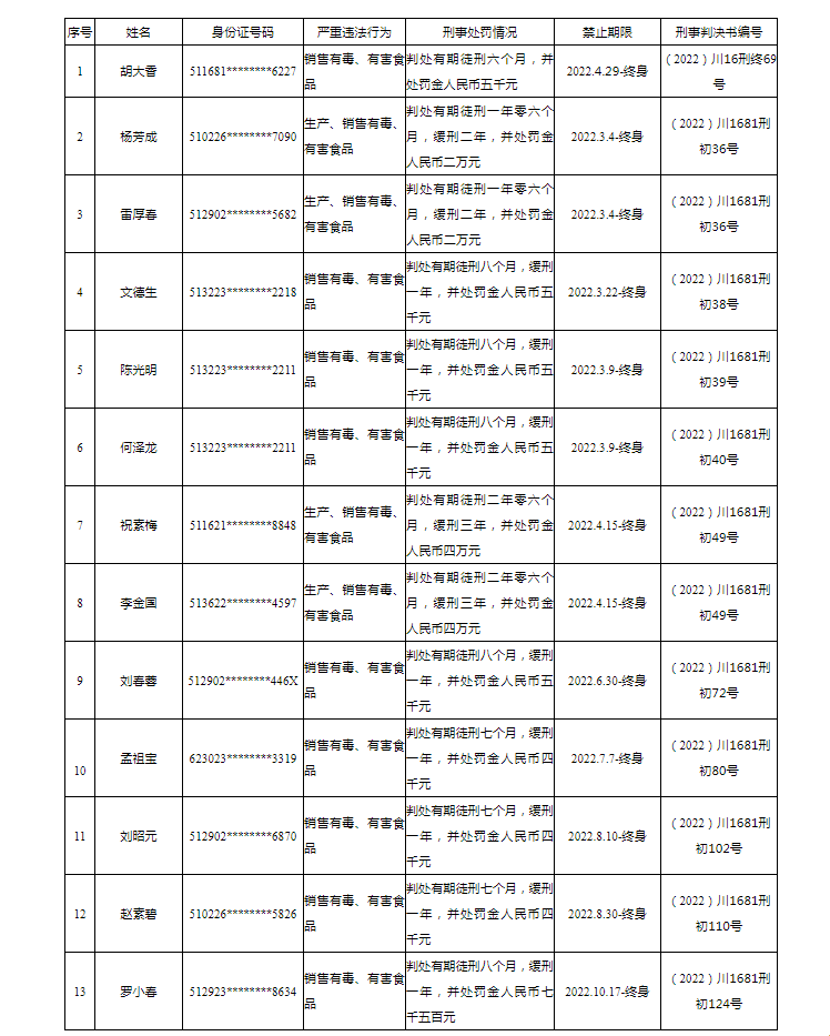 今年以来,依据人民法院的判决和《中华人民共和国食品安全法》,华蓥市市场监管局对胡某香、杨某成等12人利用回收食品加工食品或非法添加的行为做出了“禁止从事食品生产经营管理工作,也不得担任食品生产经营企业食品安全管理人员的人员”的决定,并予以了公告。该批案件是华蓥市市场监管局处置的第一批“处罚到人”的行政处罚案件。