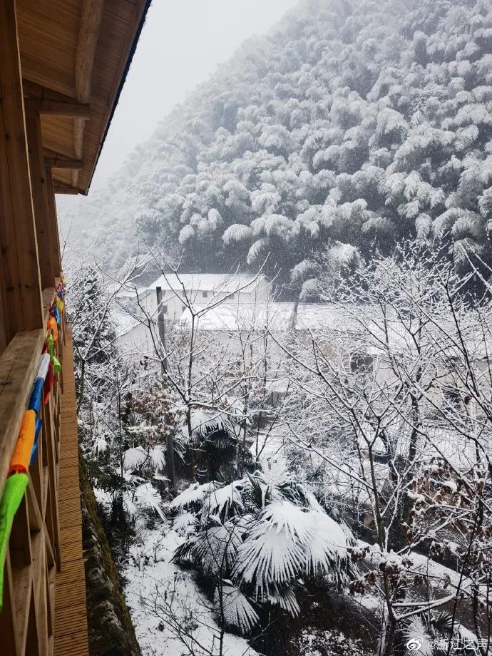 建德市乾潭镇森山里·汪活源民宿村“村长”叶德宇一大早发来照片,终于下雪了。期盼已久的这场雪,始于昨天晚上8点左右,目前还在下,大约已有3厘米的厚度。虽然雪景很美,但进出山路要特别注意安全。