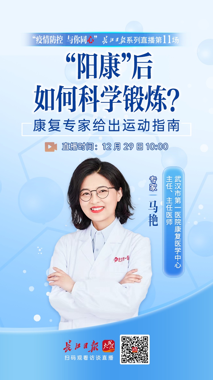长江日报大武汉客户端12月29日讯(记者张维纳)最近,频上热搜的“心肌炎”话题引起网友们的担忧,“阳康”后运动就会引发心肌炎吗?心肌炎是一种常见病吗?转阴后多久可以运动?12月29日,武汉市第一医院康复医学中心主任、主任医师马艳做客长江日报直播间,就网友关心的话题进行现场解答。大武汉客户端、长江日报视频号、长江日报微博平台和37度里丨长江健康融媒视频号同步进行直播。