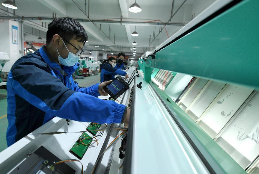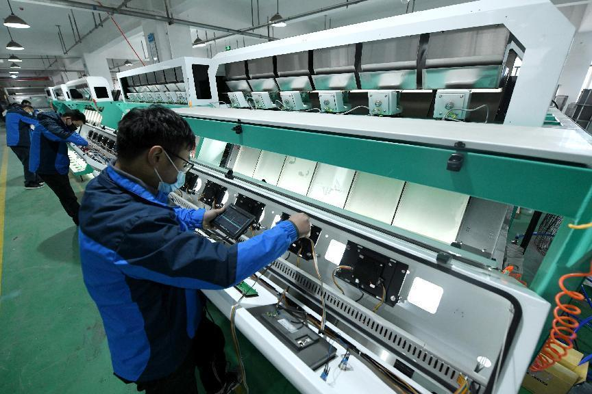 2022年12月29日,在合肥市瑶海区的长三角数字科技示范园内,安徽文尧智能光电科技有限公司生产线上的工人在调试出口到海外的CCD智能色选机。