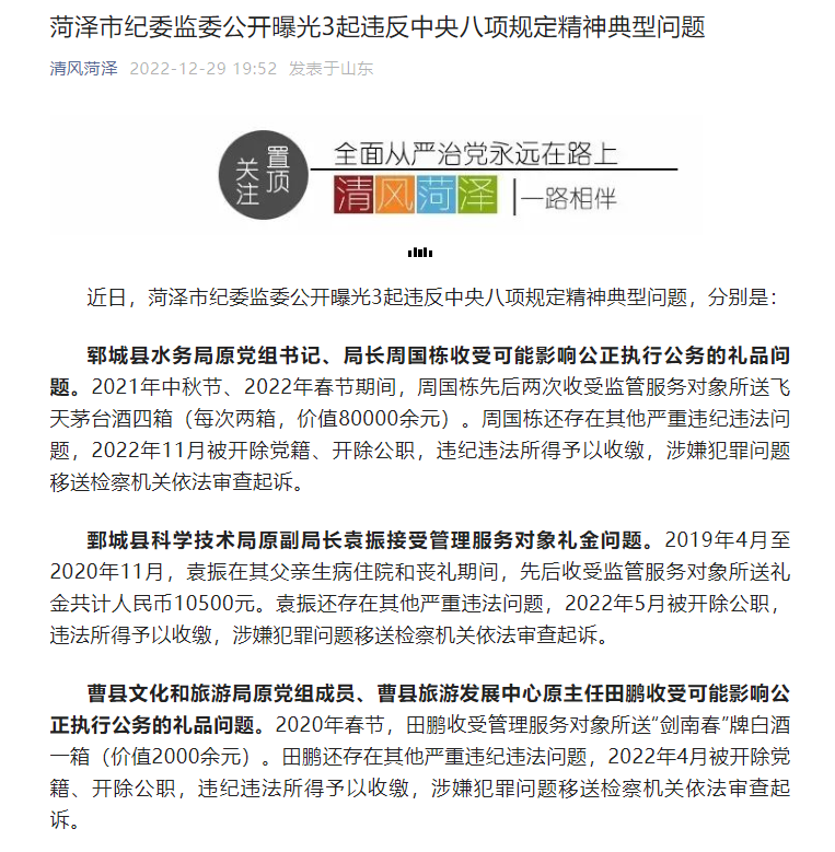 曹县文化和旅游局原党组成员、曹县旅游发展中心原主任田鹏收受可能影响公正执行公务的礼品问题。2020年春节,田鹏收受管理服务对象所送“剑南春”牌白酒一箱(价值2000余元)。田鹏还存在其他严重违纪违法问题,2022年4月被开除党籍、开除公职,违纪违法所得予以收缴,涉嫌犯罪问题移送检察机关依法审查起诉。