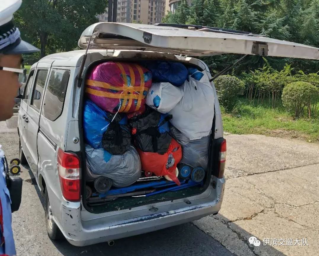 案例警示:8月28日上午,洛阳交警伊滨大队民警在开元大道与孝文大道交叉口执勤时,对一辆银灰色面包车进行检查。