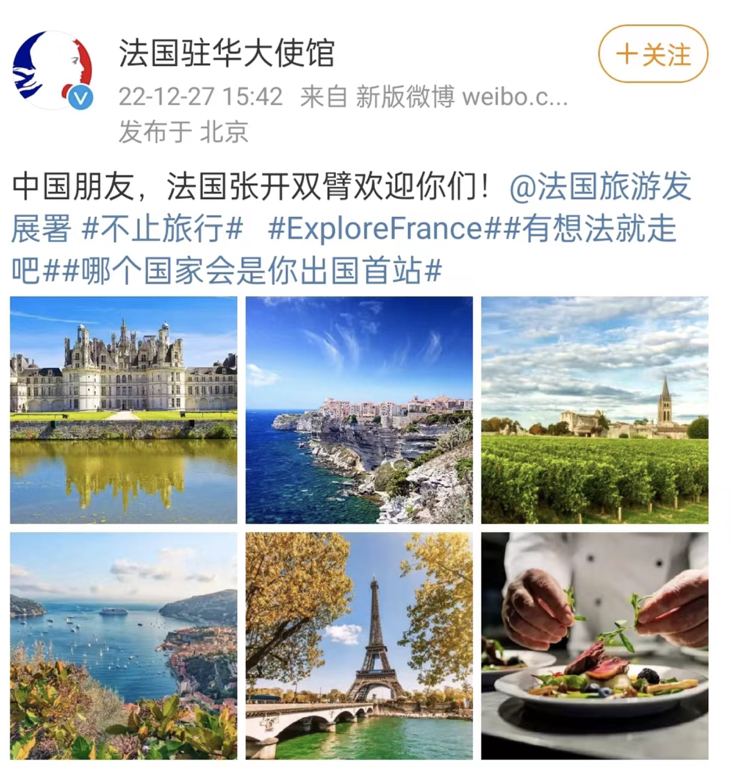 法国驻华大使馆:“中国朋友,法国张开双臂欢迎你们!”