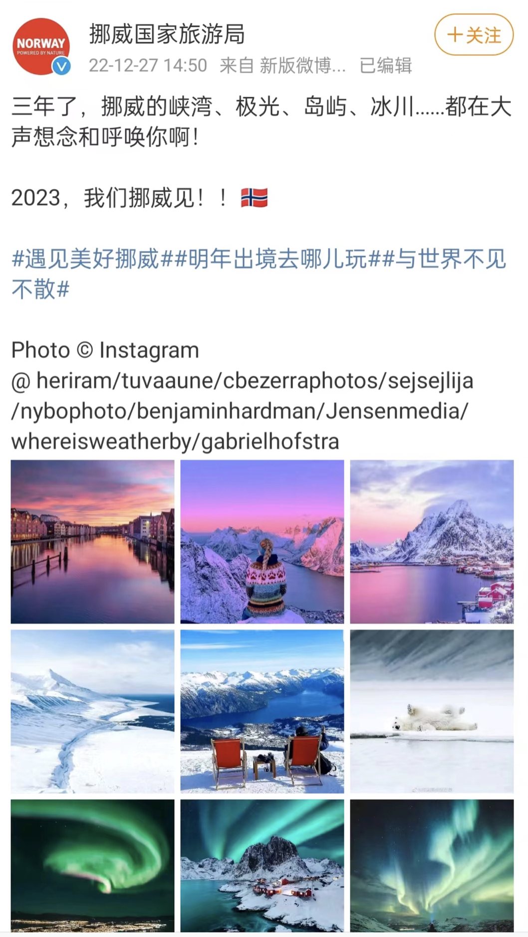 挪威国家旅游局:“三年了,挪威的极光、冰川都在大声想念和呼唤你啊!”