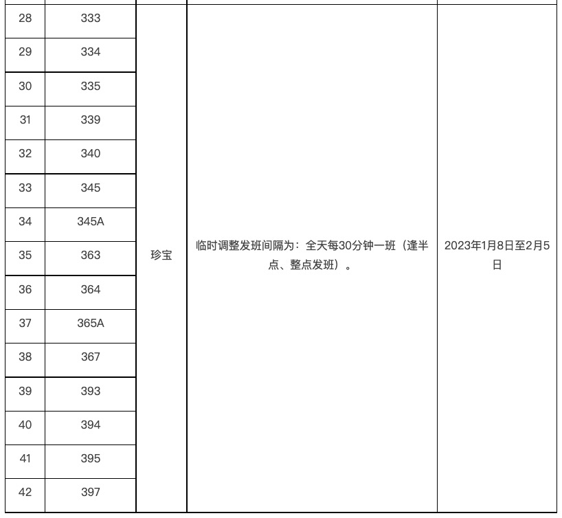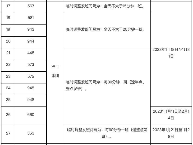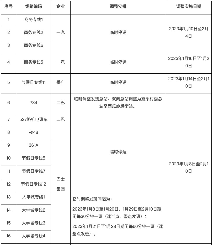 2023年春节期间临时调整线路汇总表