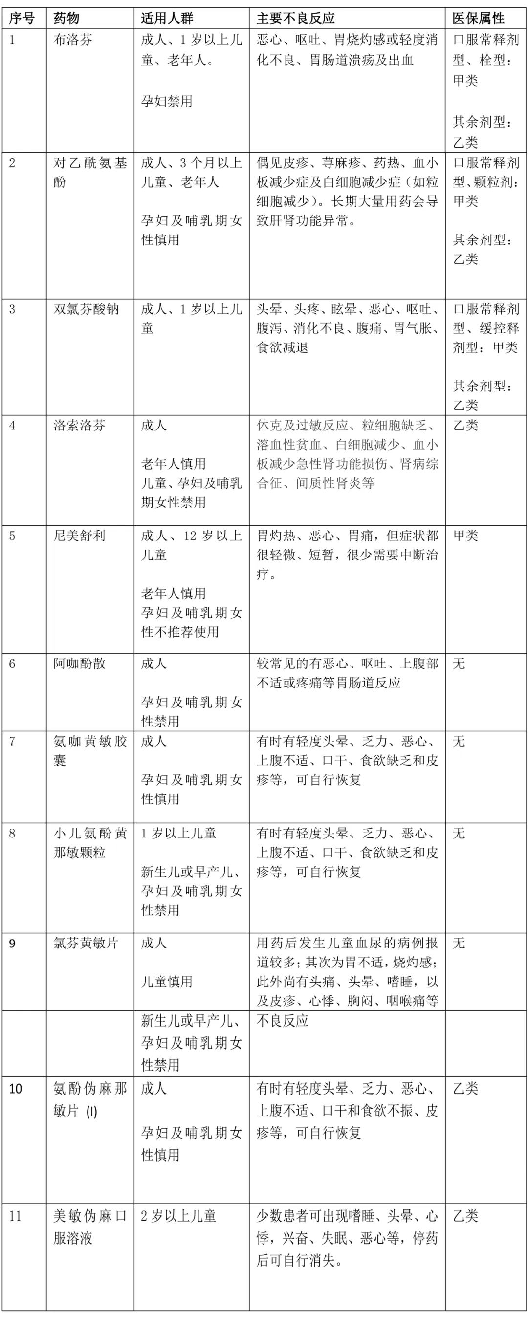 推荐药物:布洛芬、对乙酰氨基酚、双氯芬酸钠、洛索洛芬钠、尼美舒利、复方感冒药(阿咖酚散、氨咖黄敏胶囊等)