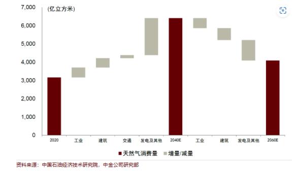 一是气量来看,根据中国石油经济技术研究院预测,中国天然气需求将在2040年前保持较快增长,峰值将近6500亿立方米,增量主要来自工业/发电等,而后平稳下降,2060年约4100亿立方米。