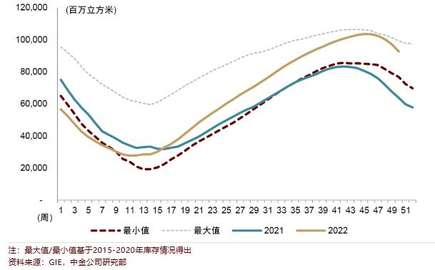 若欧洲经济步入衰退,欧洲对LNG现货需求下滑幅度可能超出市场预期,导致国际LNG现货价格下跌幅度超出预期。此外,我们也观察到欧洲目前天然气库存水平仍处于历史高位,若欧洲冬季天气偏暖,也可能导致2023年现货LNG价格下行幅度超出我们预期。