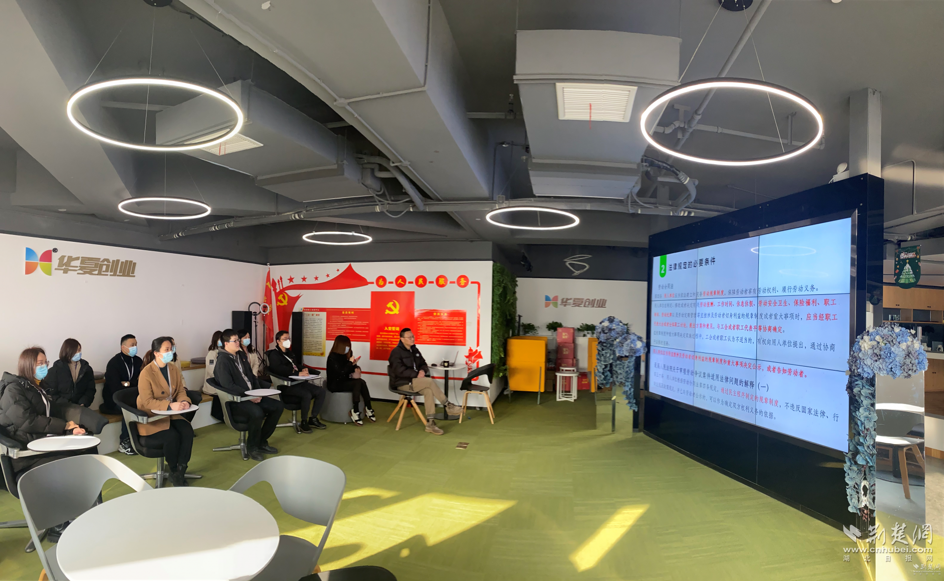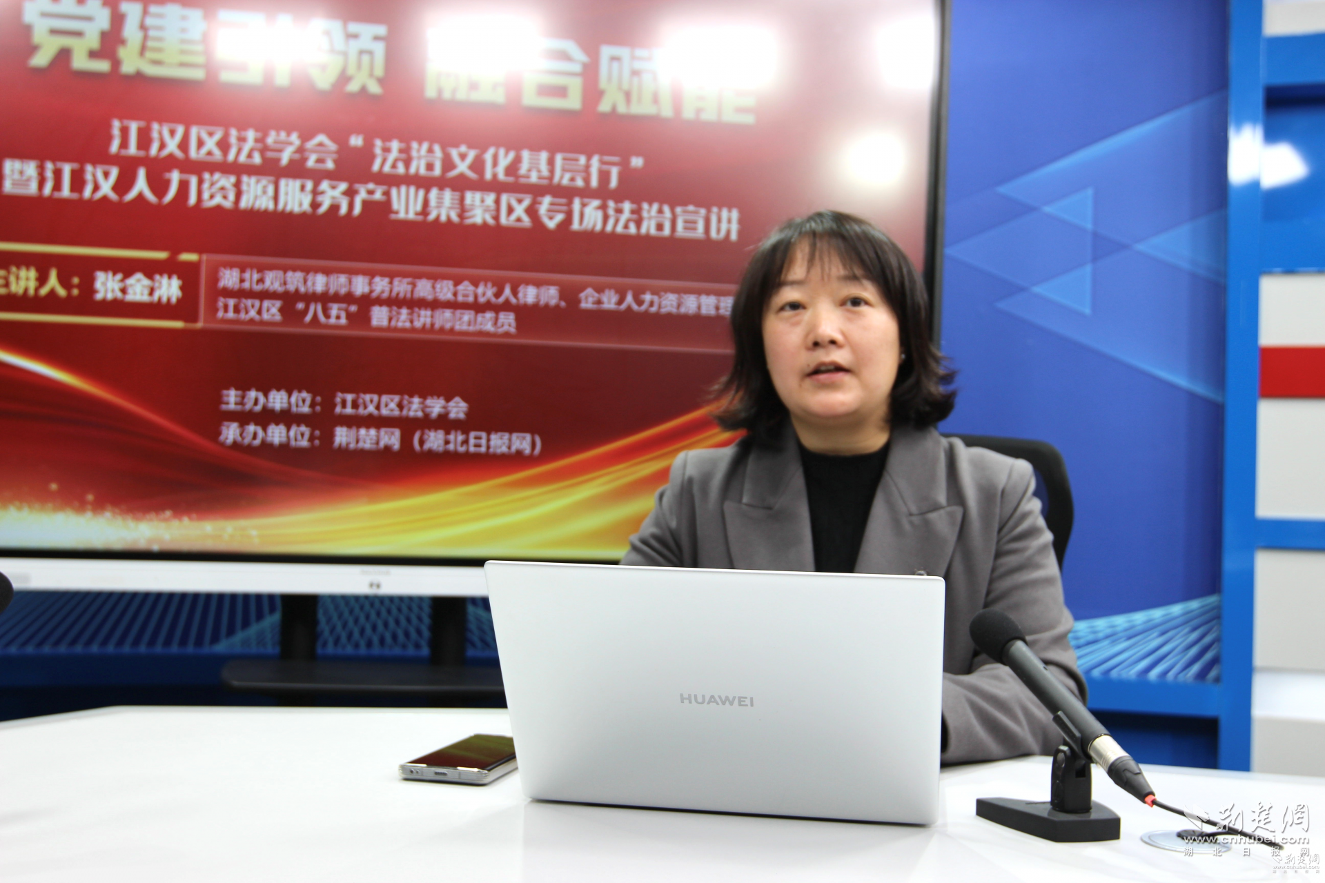 本次活动特邀湖北观筑律师事务所高级合伙人律师、企业人力资源管理师、江汉区“八五”普法讲师团成员张金淋,分别以“企业用工管理实务之冲突解决”“企业安全及风险防范法律知识”为主题进行宣讲。江汉人力资源服务产业集聚区、江汉创谷文化与科技融合示范集聚区相关企业在“云端”集中收看。