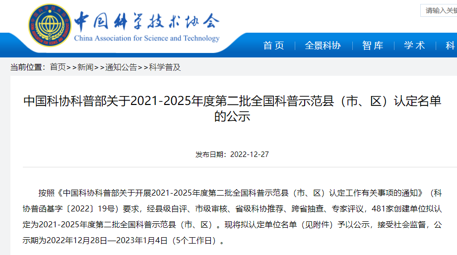 按照《中国科协科普部关于开展2021-2025年度第二批全国科普示范县(市、区)认定工作有关事项的通知》(科协普函基字〔2022〕19号)要求,经县级自评、市级审核、省级科协推荐、跨省抽查、专家评议,481家创建单位拟认定为2021-2025年度第二批全国科普示范县(市、区)。现将拟认定单位名单(见附件)予以公示,接受社会监督,公示期为2022年12月28日—2023年1月4日(5个工作日)。