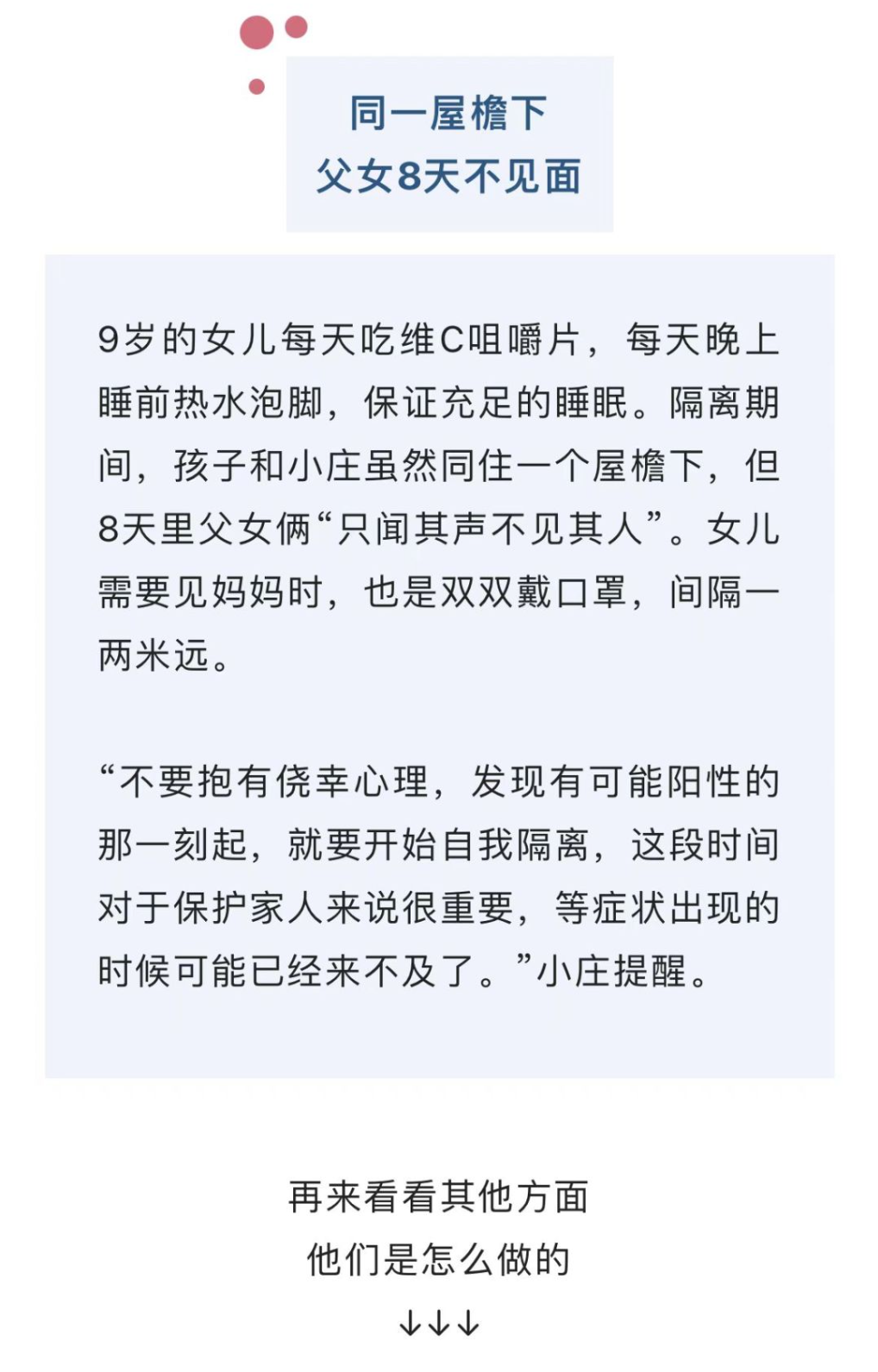 17日,小庄一家三口到老丈人家吃晚饭。18日,他接到老丈人电话,老丈人说这两天接触过的一个朋友“阳”了,提醒他用抗原自己检测一下。当天傍晚,小庄做了核酸检测。当晚,一家三口又用抗原检测了一下,都是阴性。但小庄不放心,决定一人一个房间先各自隔离起来。