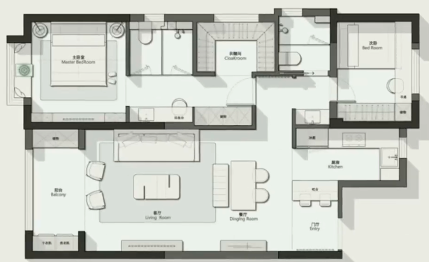 整体户型我们基本按照业主要求来实现,最大程度的保留了主卧的舒适型以及提升主卧的生活配置。我们这里做开放式厨房来满足对空间感的需求层次。虽然整体户型不是很大,但是户型整体这样布置,空间感更大,更协调。