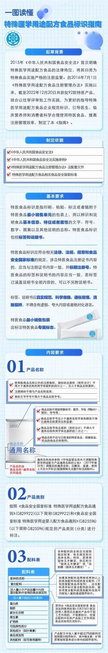 《指南》规定,特医食品标识是用以辨识和说明食品基本信息、特征或者属性的文字、符号、数字、图案以及其他说明的总称,包括标签和说明书。《指南》明确提出了特医食品标签和说明书需要标示配料表、营养成分表、食用方法和食用量、适宜人群等13项内容,有助于消费者打破认知壁垒,更好地根据自身情况选择特医食品。