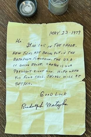 据悉,纸条写于1979年5月23日,是女子在拆除了浴室墙壁和地板上的瓷砖后发现的,上面写着:“你好。我家浴室里明天就要贴上新瓷砖了。美国就要破产了。现在我们的总统是Carter。希望你找到这张字条的时候,一切都有变得更好哦。祝你好运。Rudolph Matejka。”