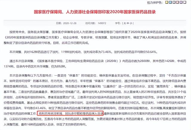 这并非个案。其实,2020年疫情发生之初,国家医保局印发《国家基本医疗保险、工伤保险和生育保险药品目录(2020年)》,将利巴韦林注射液、阿比多尔颗粒等药品调入目录,至此,国家最新版诊疗方案所列药品已被全部纳入国家医保目录。