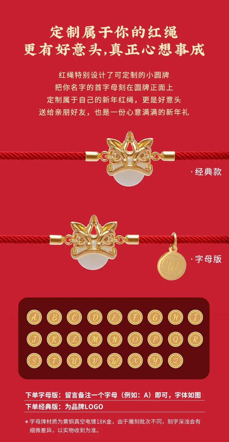 这个系列特别的地方,是另外设计了小圆牌,提供字母定制服务,让你可以打造一款专属于自己的新年红绳。