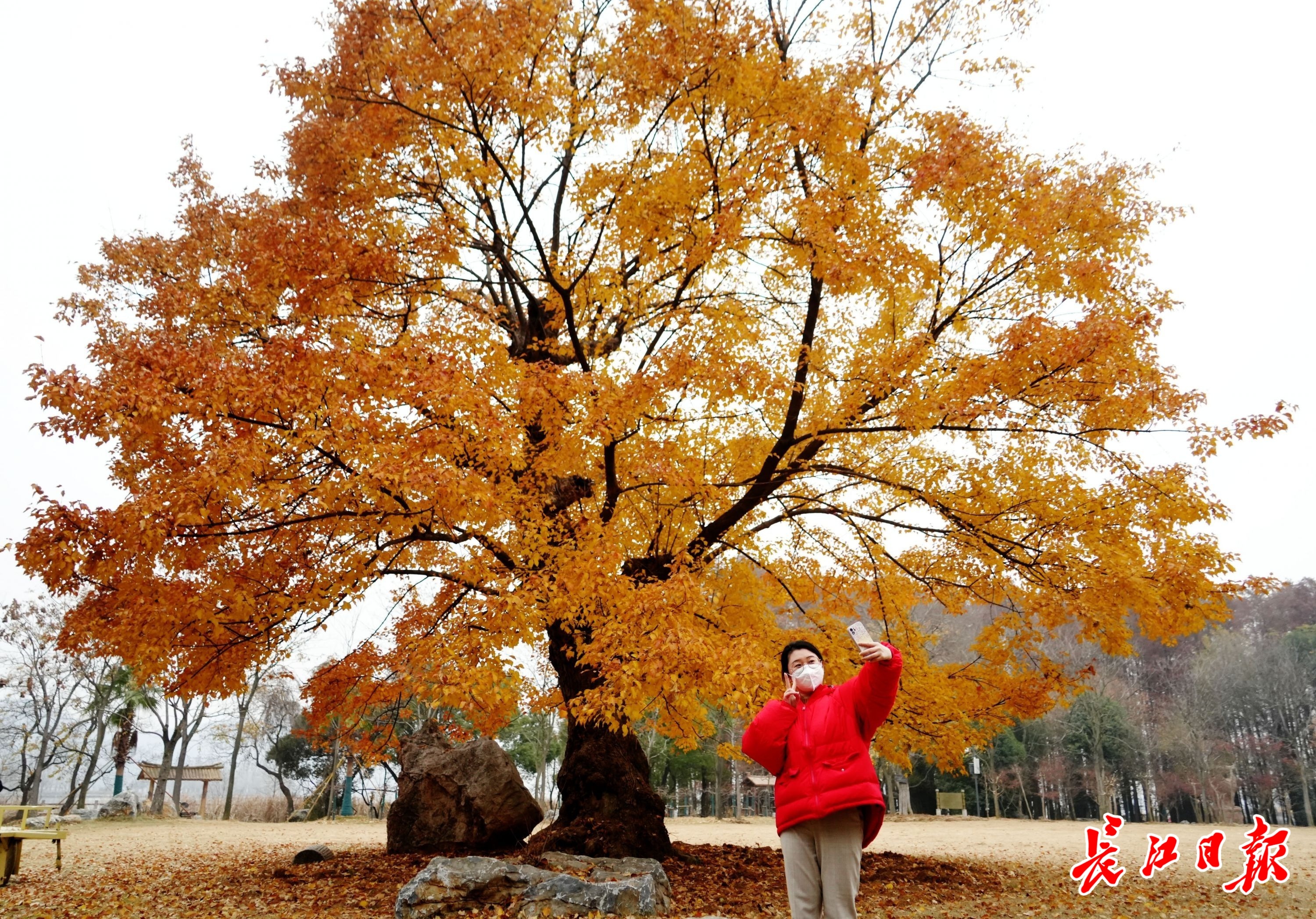 在树下站立片刻,记者看到这棵三角枫已成为园区“新宠”,同闺蜜结伴前来的熊女士围绕着树摆出多种姿势,熊女士说:“这棵树树形很好看,金灿灿的叶片同银杏的颜色一般,部分叶片在阳光照射下橙艳飘逸,赏心悦目。”摄影爱好者陈先生以树为圆心进行航拍,在他的作品里不仅展现出了三角枫优雅的姿态,还可看到层林尽染的池杉、波光粼粼的湖水、林立枝头的普通鸬鹚。“东湖的美景层出不穷,每次来拍摄都会有收获。”