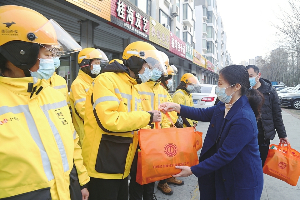 近日,日照经开区总工会工作人员将应急物品送到快递小哥手上。