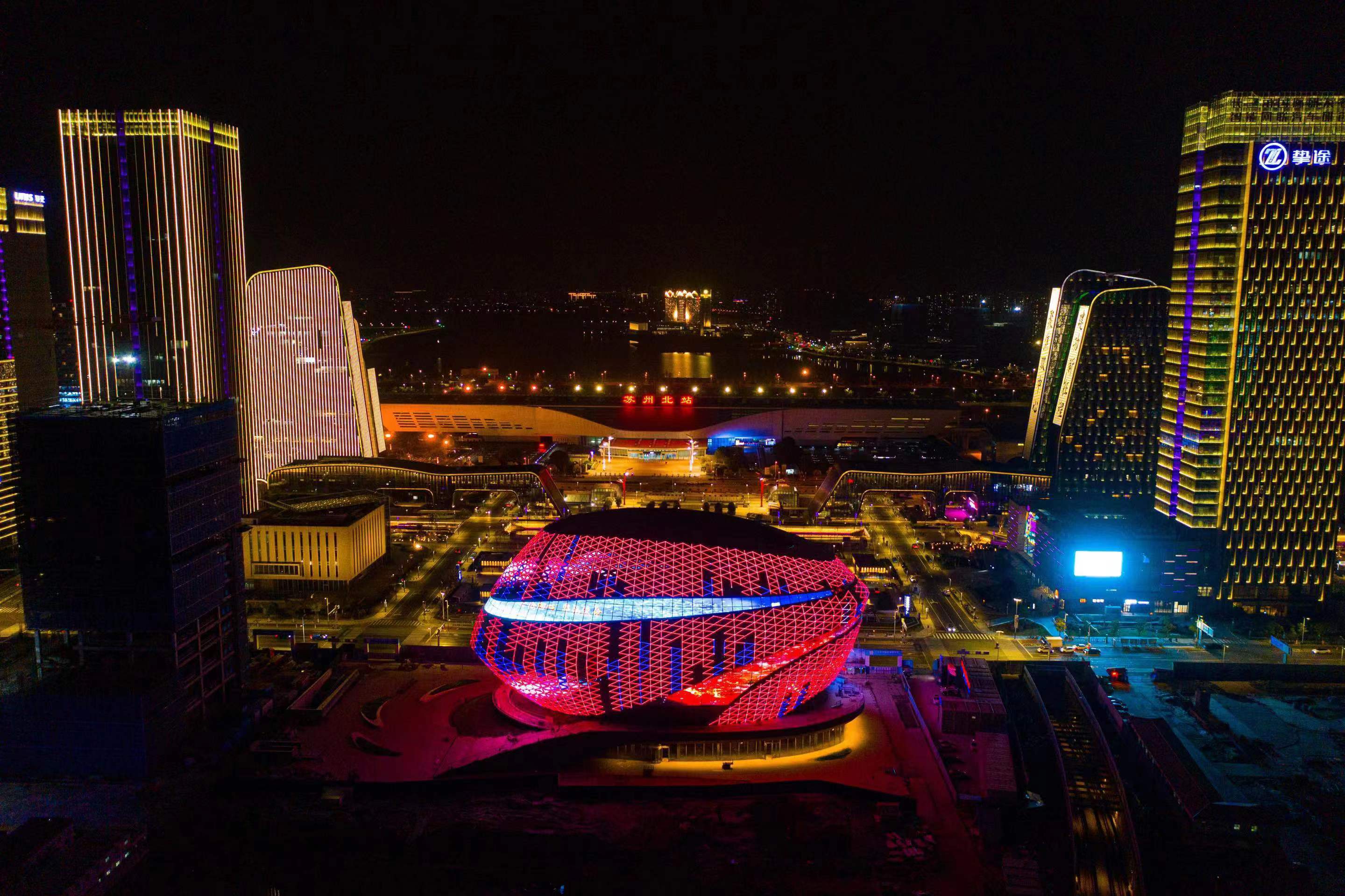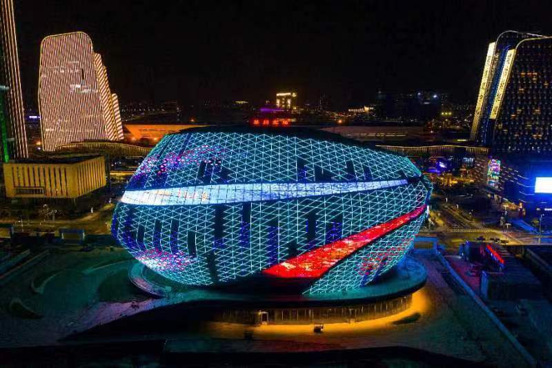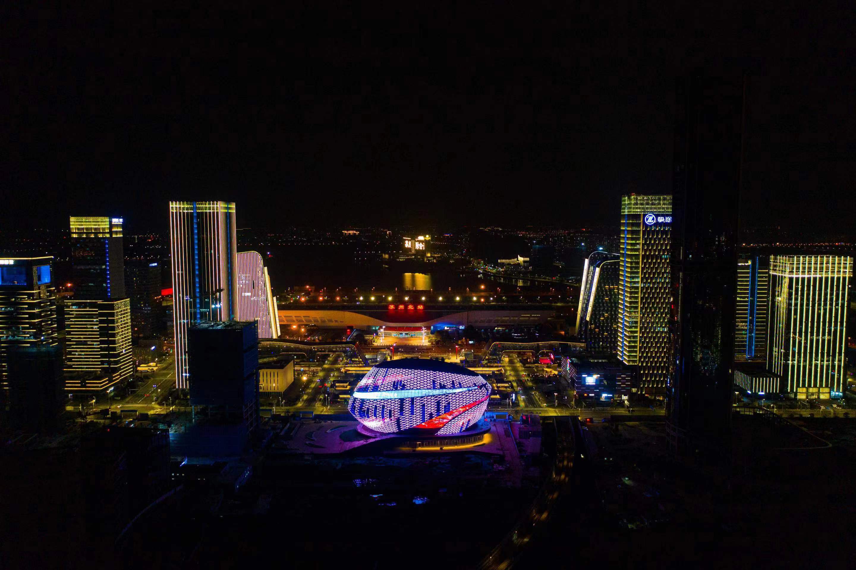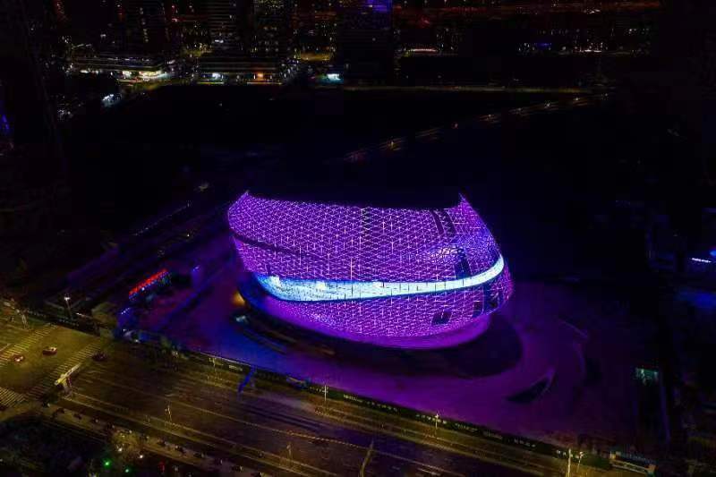 夜幕降临,超2000平米的裸晶显示LED贴膜屏、2161个立面点光源、累计长达1.3万余米的轮廓灯同时通电点亮,将科技感、现代感与建筑的艺术完美融合。