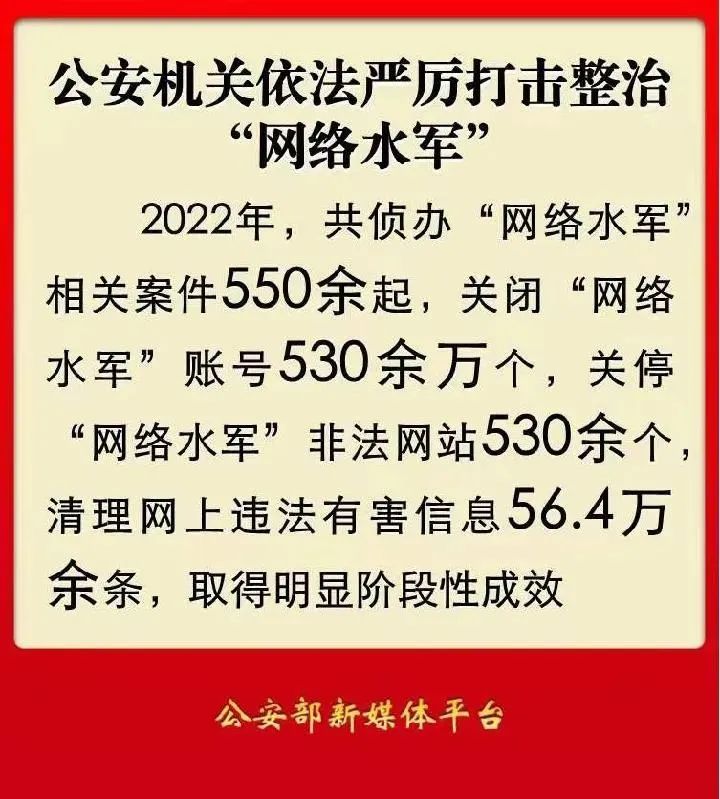 记者1月13日从公安部获悉,2022年,全国公安网安部门按照统一部署,持续依法严厉打击整治“网络水军”违法犯罪活动,共侦办“网络水军”相关案件550余起,关闭“网络水军”账号530余万个,关停“网络水军”非法网站530余个,清理网上违法有害信息56.4万余条。