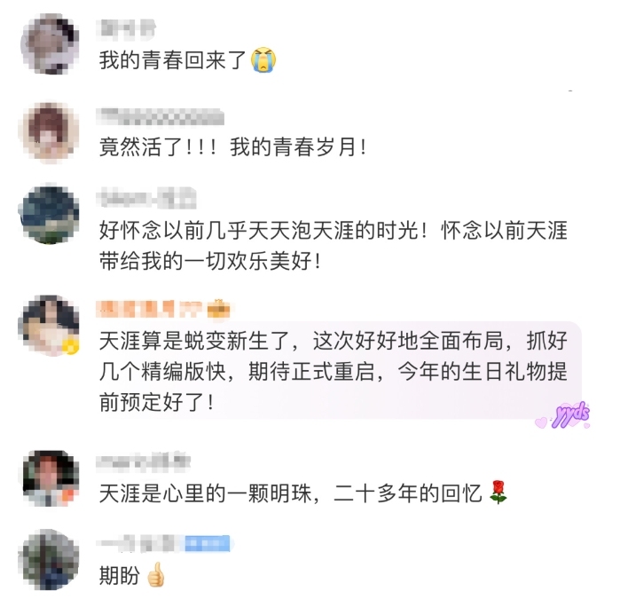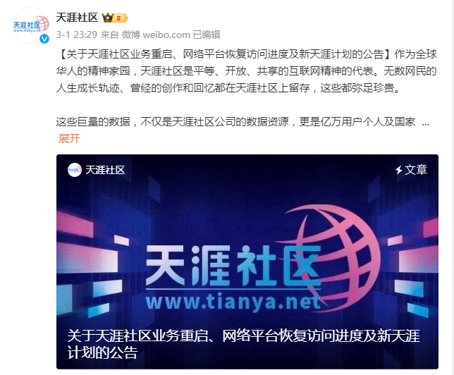 2024年3月1日,天涯社区25周年庆当晚,其官方账号发布《关于天涯社区业务重启、网络平台恢复访问进度及新天涯计划的公告》。