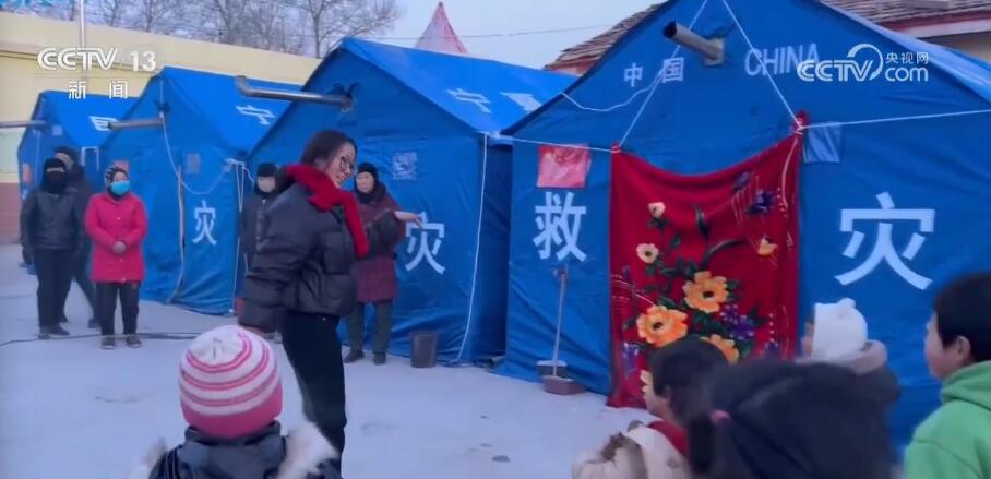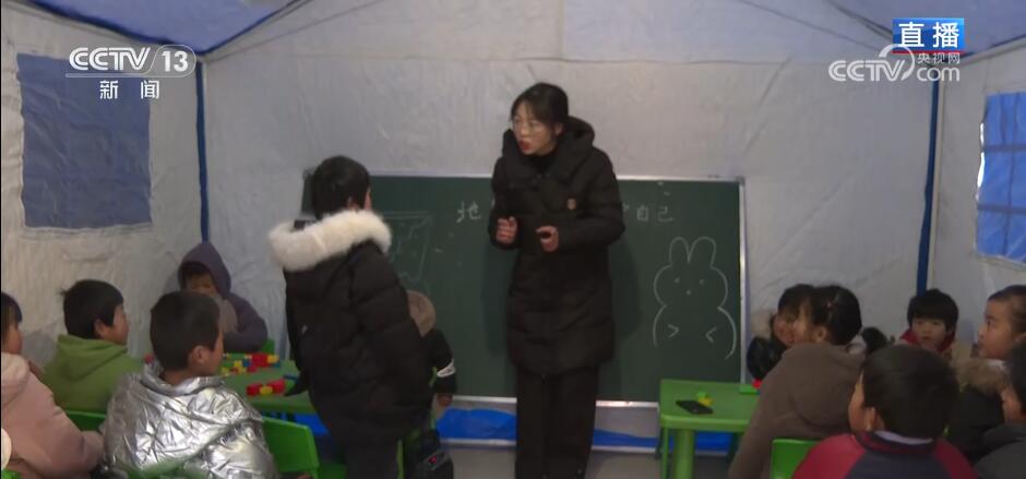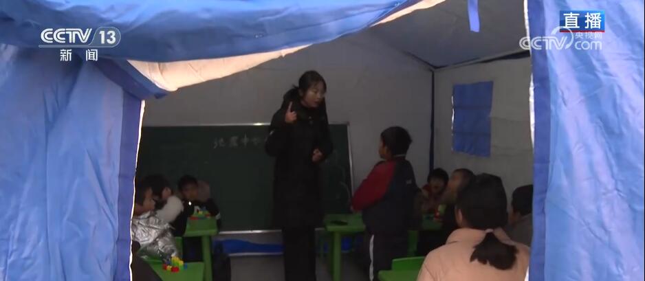 现在,临时安置点搭建起一顶帐篷,作为学生们的“临时帐篷课堂”,这会儿老师正在给孩子普及地震的相关知识和一些心理课程,并且带着孩子们做简单的游戏,让孩子在彼此的沟通和交流中舒缓心中的压力,积蓄力量。