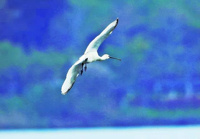 ●白琵鹭是国家二级重点保护鸟类,与黑脸琵鹭外貌特征相似,区别在于脸部那一小块是白色的。其全身羽毛为白色,眼周、颏、上喉裸皮为黄色。嘴长直、扁阔,似琵琶。胸及头部冠羽黄色(冬羽纯白)。颈、腿均长,腿下部裸露呈黑色。