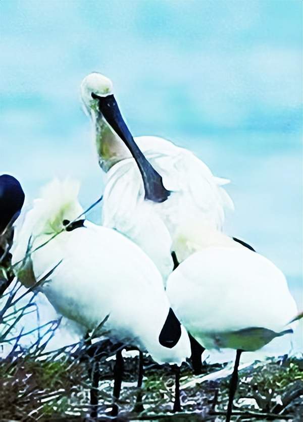 ●黑脸琵鹭是国家一级重点保护鸟类,因其扁平如汤匙状的长嘴,与中国乐器中的琵琶极为相似,因而得名。其特征是全身羽毛大体上为白色,有黑嘴和黑色腿、脚,前额、眼线、眼周至嘴基的裸皮为黑色,形成鲜明的“黑脸”。