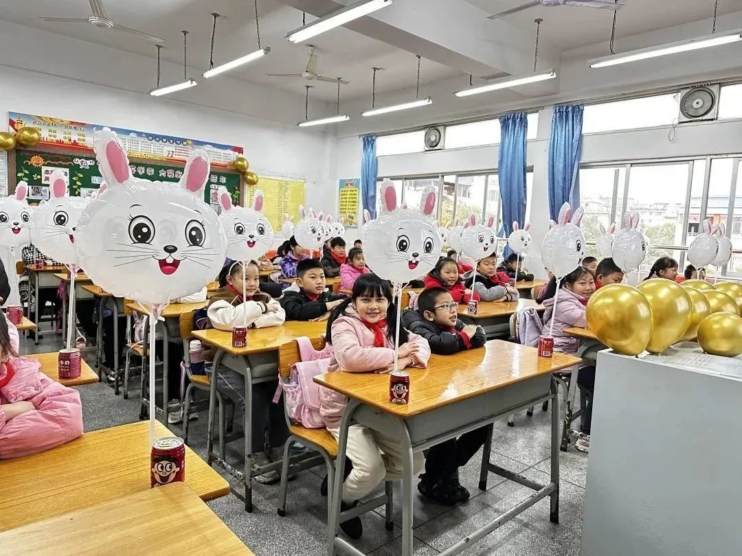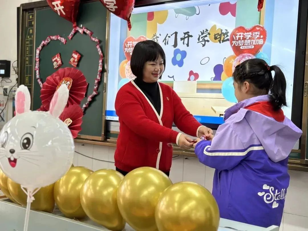 班主任们提前打扫卫生,布置班级文化,老师们精心的准备,让开学仪式感满满。瞧,迎新黑板上贴满了各式各样的主题牌,还有象征着心想事成的心愿红包墙;兔年积极进取,奋发向上的棒棒糖墙……课桌上摆放着漂亮气球、小礼物、文具书籍等。丰富的礼物,象征着多彩的生活,教室里的每个角落都充满着新学期的新气象!