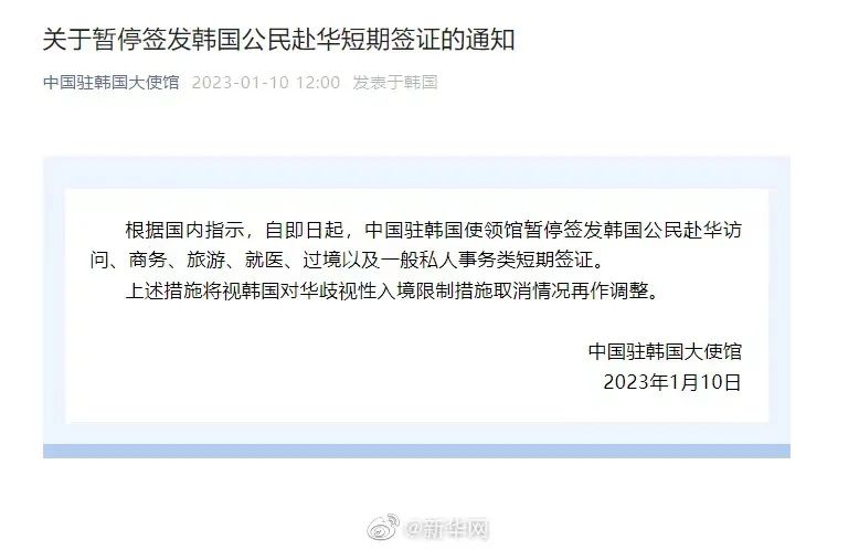 此前,中国驻韩国大使馆发布关于暂停签发韩国公民赴华短期签证的通知。详情如下: