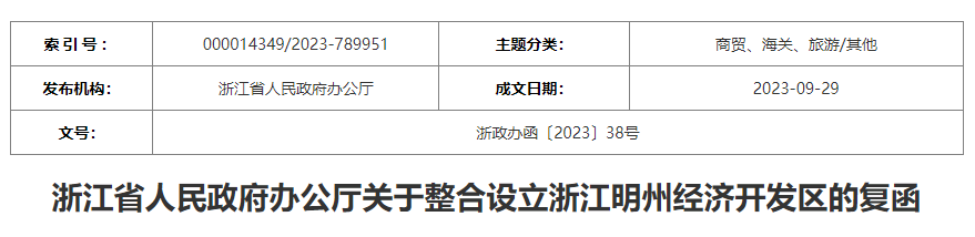 近日,浙江省政府办公厅复函,同意整合设立浙江明州经济开发区,实行省级经济开发区政策。