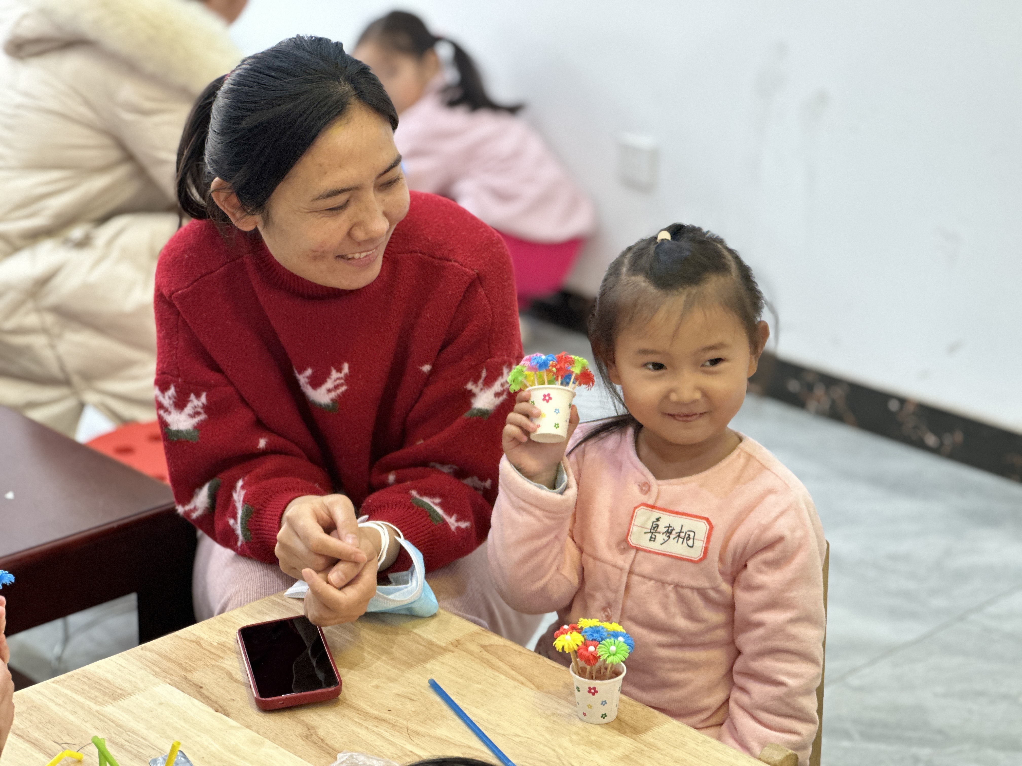 除了诵读经典,现场还设置了制作手工花环节。志愿者们为大家发放了制作手工花所需的材料,详细讲解了制作过程。接着,大家跟随志愿者开始制作,剪裁、粘贴、插花……不一会儿,一个个小盆栽便呈现在大家面前。看着亲手制作的手工花,孩子们的脸上露出了笑容。