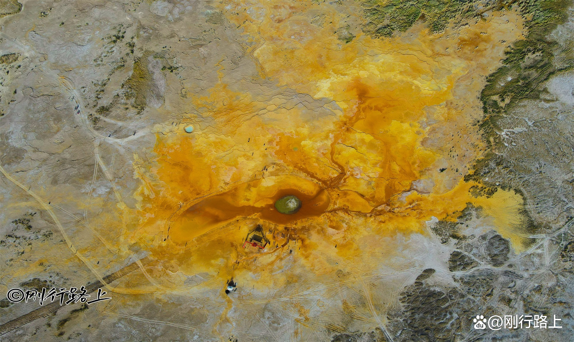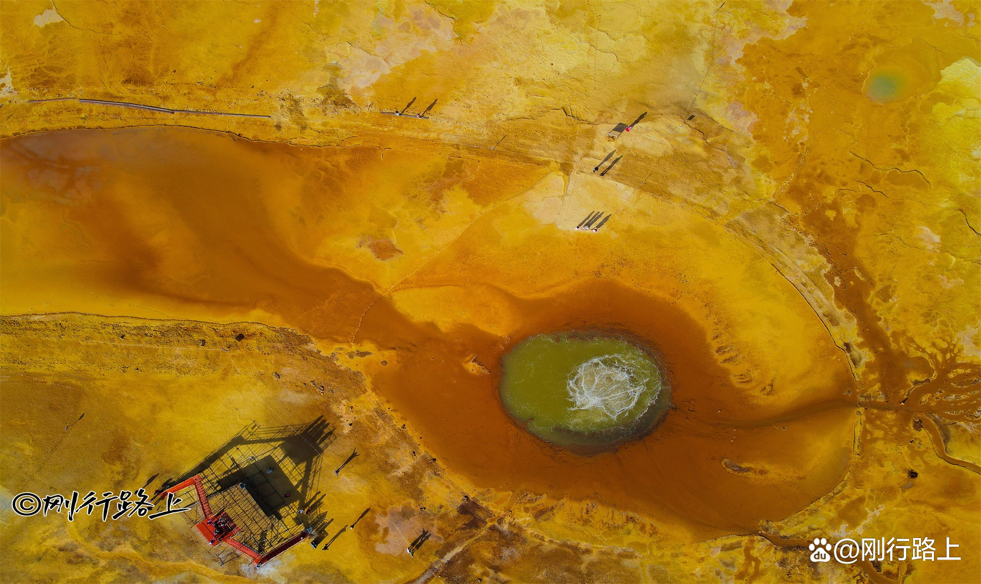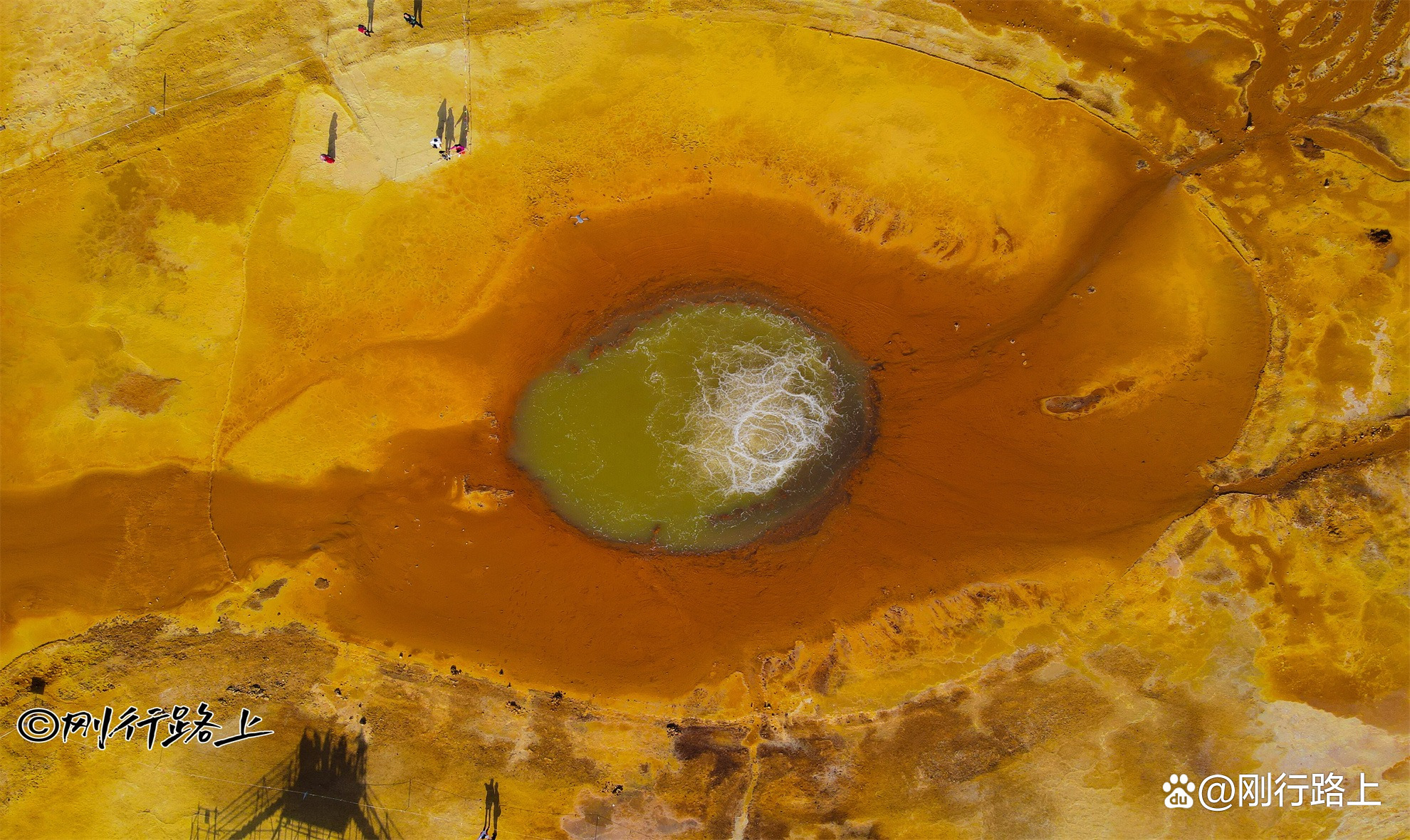 此处荒无人烟,只有一片橙色的色调和与众不同的热温泉,却让人惊艳。从空中俯瞰,泉眼与喷涌而出的泉水以及周围土地上深红色环带状的沉淀物,组成了一个奇特的瞳孔造型,仿佛一只镶嵌在大地上的眼睛,俯瞰就像是一只眼睛盯着你看,因此才有了“大地之眼”“恶魔之眼”这样的称呼。