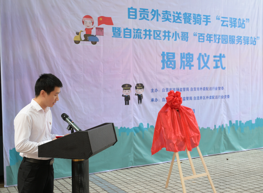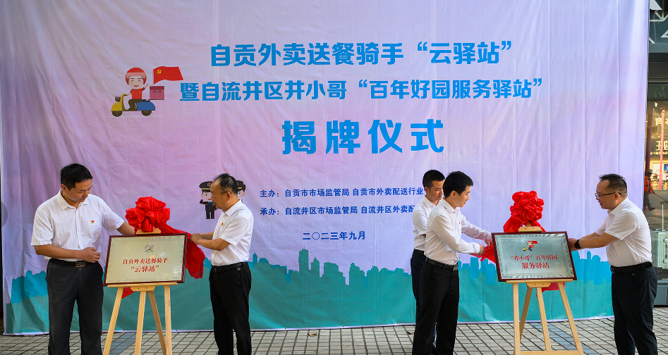 9月15日上午,自贡外卖送餐骑手“云驿站”暨自流井区井小哥“百年好园服务驿站”揭牌仪式正式举行,自贡市委组织部四级调研员李晓征,自贡市市场监管局党委书记、局长余忠,自贡市市场监管局党委委员、副局长、市外卖配送行业党委书记喻峰,自流井区委常委、组织部部长邹骏,自流井区委组织部副部长、两新工委书记(兼)、党建办主任(兼)万洪,自流井区市场监管局党委书记、局长朱俊英等领导和20余名外卖送餐员参加。