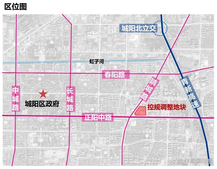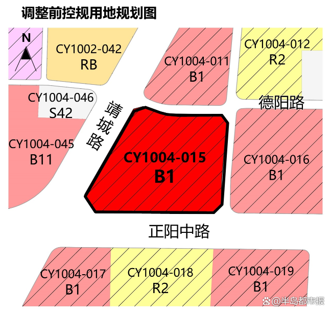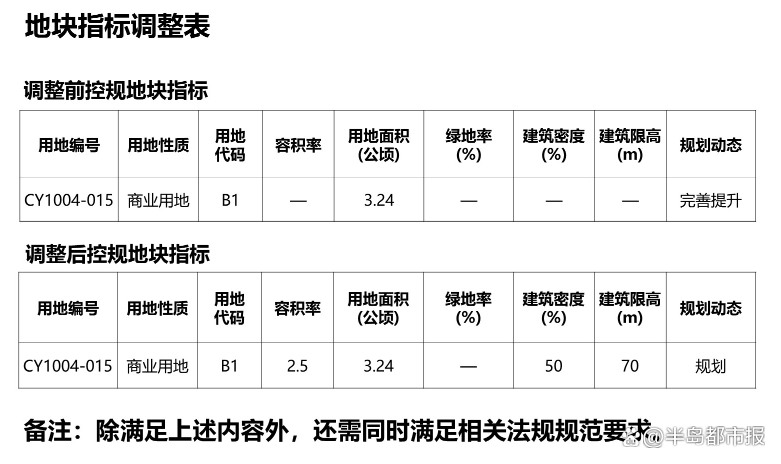 此次调整,根据市政府批复的《城阳区城阳街道南部片区控制性详细规划》,该地块用地性质为商业用地,未对容积率进行明确表述,规划动态为完善提升;控规调整后,商业用地性质不变,容积率由完善提升调整为2.5以下。