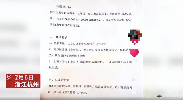 2月6日,浙江杭州。有网友称,杭州法华寺招聘和尚,网传图片中写明待遇补贴、具体要求及实习安排。在图片下方公布了面试时间及地点 ,经地图检索发现,该面试地点为法喜寺。