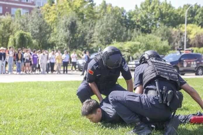 为切实保障广大师生人身安全,日前,公安南开分局学府街派出所联合市公安局特警总队、公安南开分局特警支队深入南开大学,组织师生开展反恐防暴应急演练,宣传普及反恐防暴应急知识和技能,有效防范校园内发生突发伤害事件。