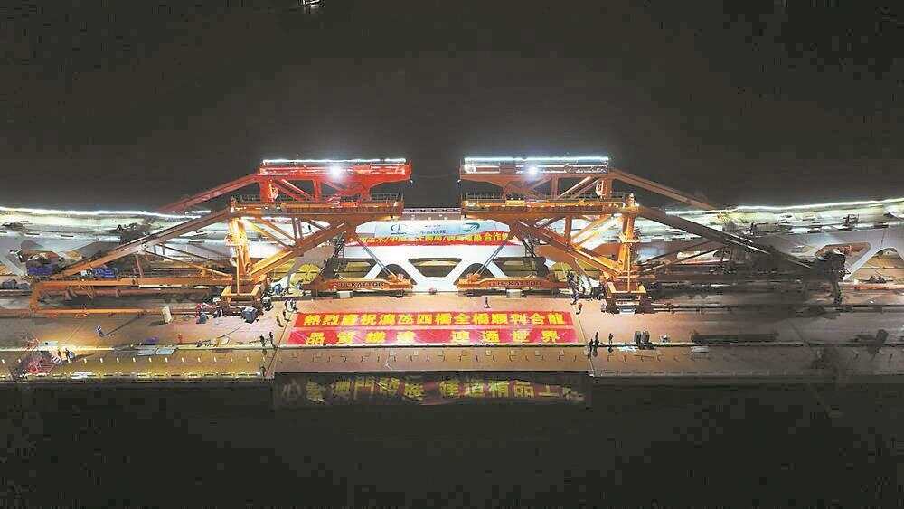 羊城晚报讯 记者郑达、通讯员陈乐乐摄影报道:3月12日,在珠澳两地海事部门的携手保障下,澳门最大的跨海大桥——澳氹四桥最后一节桥梁箱体吊装完成,大桥实现顺利合龙。