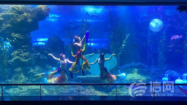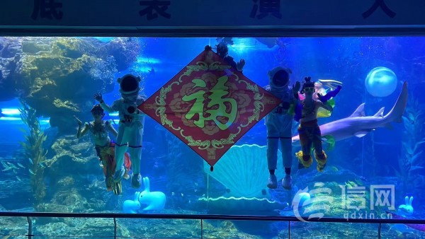 来到青岛海底世界,穿越过光怪陆离的海底隧道,沿着海底鱼群引领的方向,在一簇光亮的中心,海水在灯光的映照下泛着点点波光,成群的鱼儿在来回的游动,在层层叠叠的水波和鱼群之后,似是有衣袂飘飘若隐若现;再凝神望去,却看到一个如天外飞仙一般的女子,正神态自若的悠然起舞,一时间美若洛神,连路过的鱼群都忍不住簇拥上前,与她一起舞动起来……本次春节期间限定表演共包含四个部分,分别是“嫦娥回家”“海底飞天”“盛世欢歌”“玉兔迎春”。