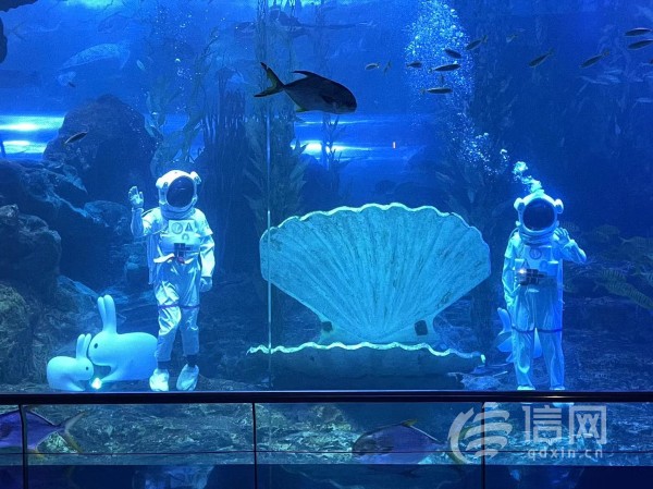 随着灯光逐渐亮起,只见水下一名身穿宇航服的航天员引领着嫦娥仙子缓缓出现在蔚蓝的水波中,嫦娥的衣袖在海水的浮力作用下轻轻飘起,柔美至极。海中的鱼群家族则围绕在一起,好似在打量着这位天外来客,航天员友好地跟嫦娥仙子介绍着这些海底的原住民,而鱼儿们也对她的到来表示热烈欢迎。航天员这次顺利完成了探月任务的同时,不仅带回来了珍贵的月壤样本,与我们的海洋精灵共享,还邀请到了嫦娥仙子和玉兔重返人间,来到海底,这可是海底世界的一大乐事。