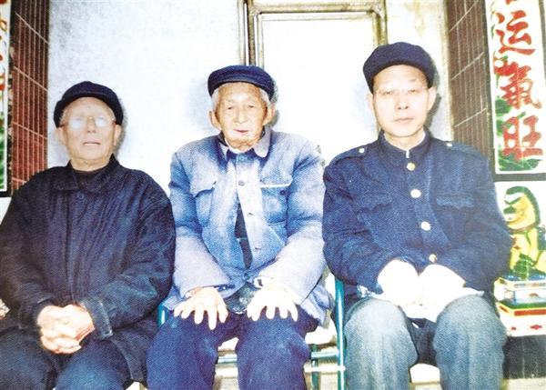 陈焕章(中)、王海成(左)接受唐贵知(右)采访时合影。(图片选自《小何庄壮烈战歌》)