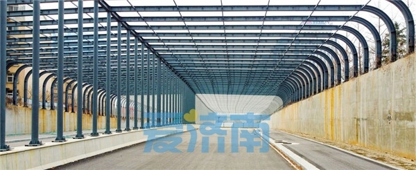 在春暄路隧道的南首,隧道出口道路与经十东路交会,路面已经铺设了沥青层,道路上方隔音屏障的钢架结构已经安装到位,下一步将进行隔音板的安装施工。