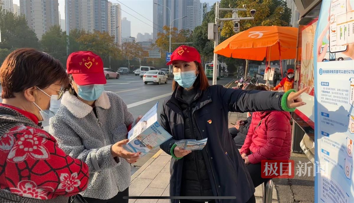 28日早高峰,武汉公交集团第五营运公司“小红帽”党员服务队的志愿者们来到珞雄路公交场站,向市民乘客发放“武汉公交智慧乘车指南”宣传折页,详细讲解“实时公交”出行服务功能。