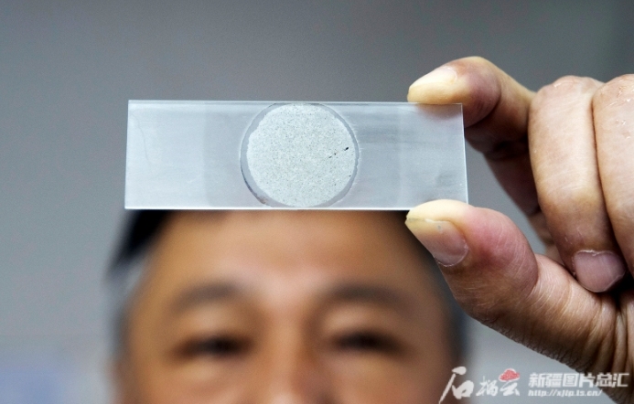 李裕杰是新疆油田实验检测研究院地质实验中心的岩石制片师。在实验室他要将手中的岩石切片磨成0.03毫米的薄片,然后交给地质师放到显微镜下观测,分析是否有油气显示。