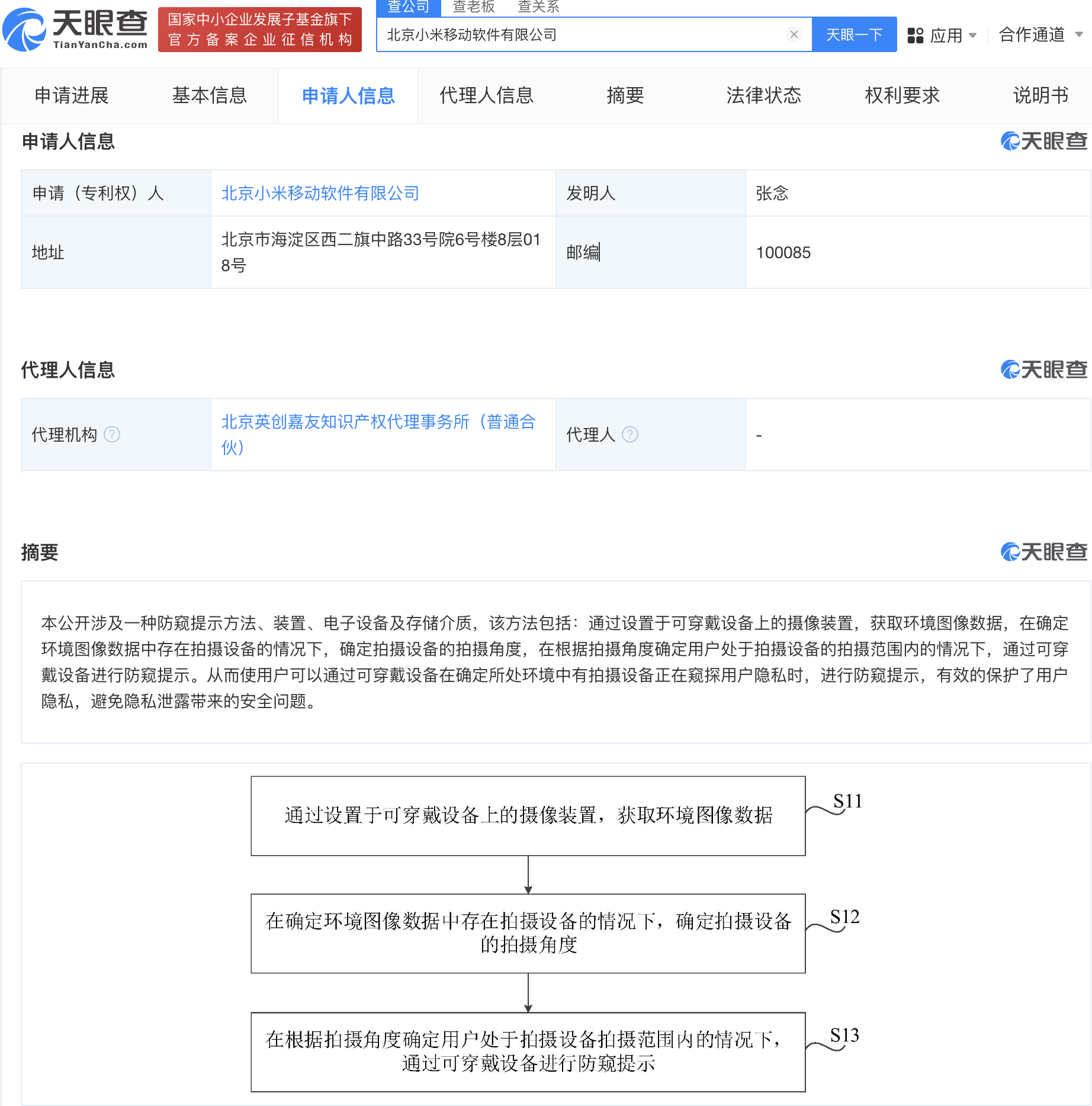 天眼查App显示,该方法包括通过设置于可穿戴设备上的摄像装置,获取环境图像数据,在确定环境图像数据中存在拍摄设备的情况下,确定拍摄设备的拍摄角度,在根据拍摄角度确定用户处于拍摄设备的拍摄范围内的情况下,通过可穿戴设备进行防窥提示。