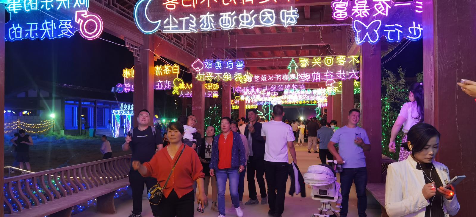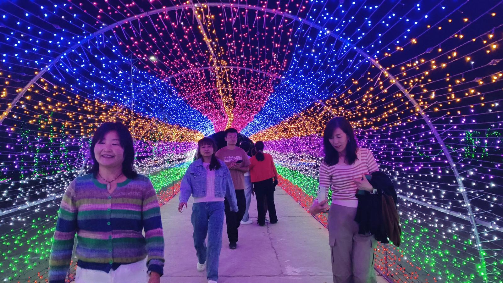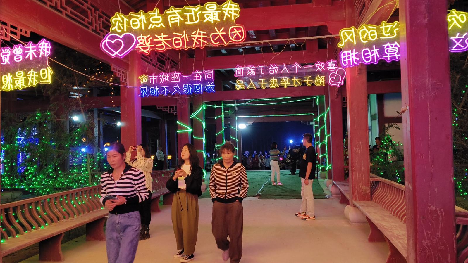 携亲朋好友走进公园,灯光为公园披上一层霓虹衣裳,彩灯下流淌的光影,构成了一幅璀璨夺目的景象。漫步其中,尽情感受一步一景、一景一情的魅力。美猴王模仿秀、八戒魔术、唐僧唱歌……一场精彩纷呈的《西游记》主题展演互动正在进行,台前观看的游客,都在用心领略此刻的万种风情。动感的音乐、曼妙的舞姿,演职人员和游客载歌载舞,篝火晚会让每个人都变成了主角。